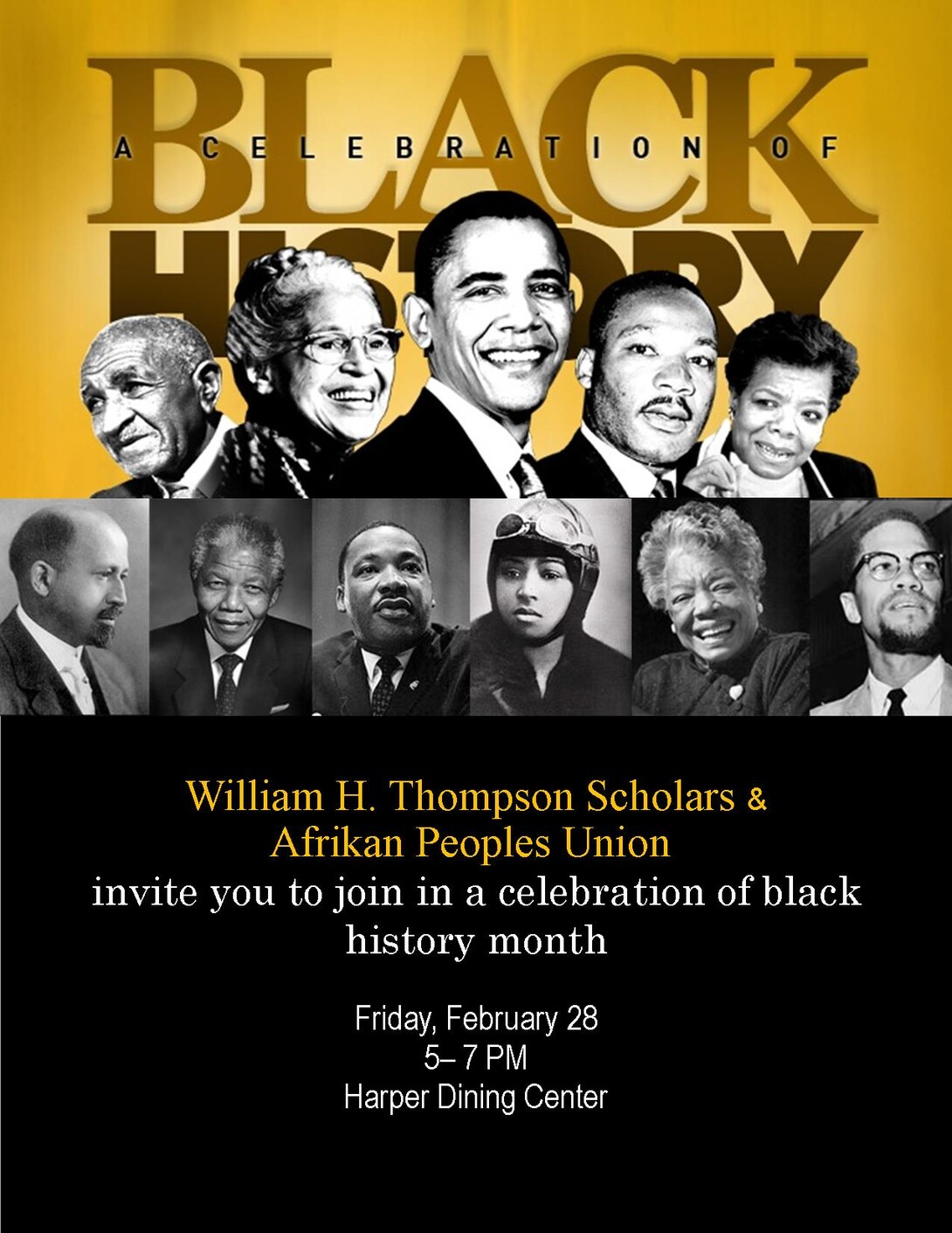 The William H. Thompson Scholars and Afrikan Peoples Union are hosting a Black History Month celebration 5 to 7 p.m. Feb. 28 at the Harper-Schramm-Smith Dining Center. The event is open to the faculty, staff and students.