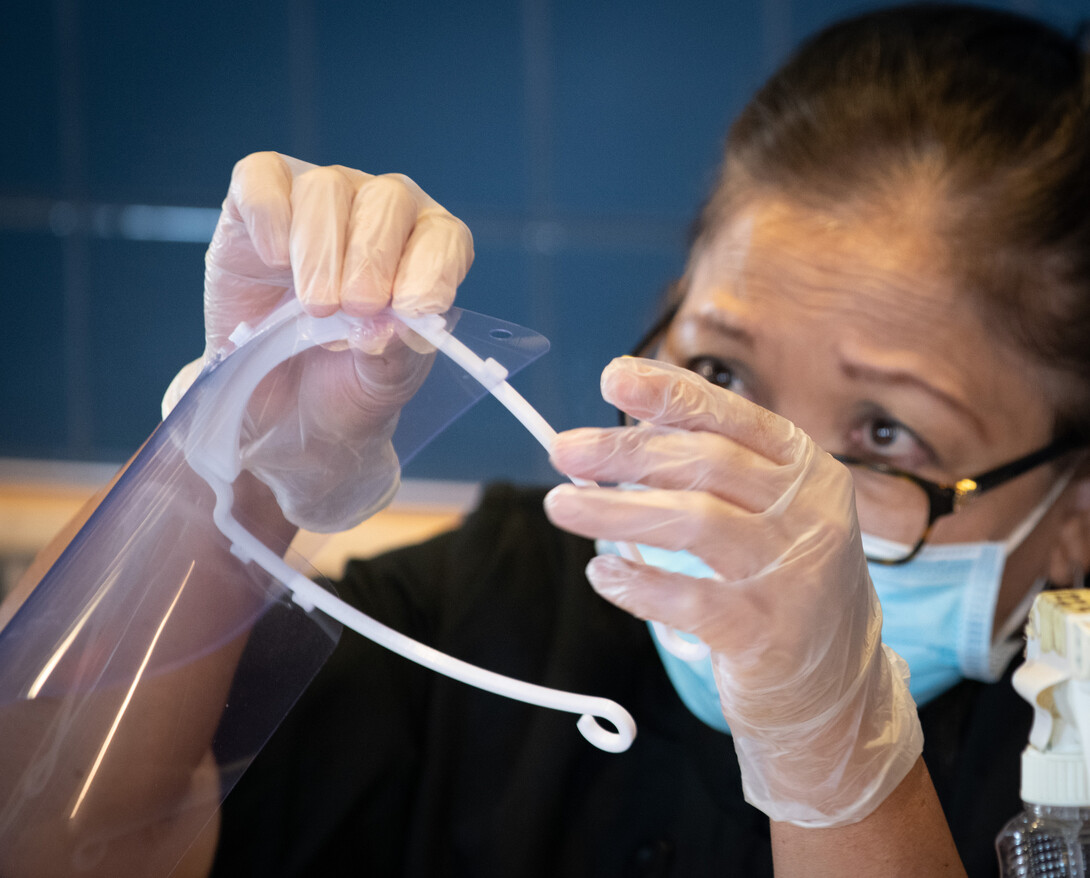 Rochan Pinho, senior dining service associate, snaps together a face shield at Harper Dining Center. Pinho used his own 3-D printer to make nearly 200 shields.