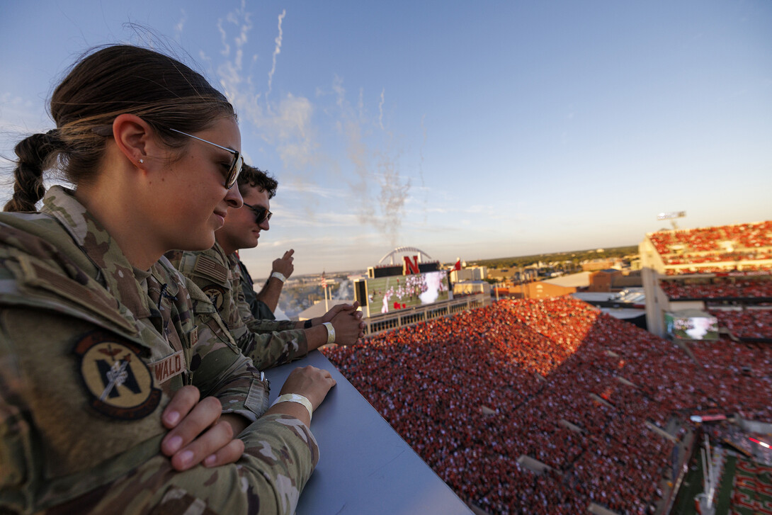 It’s game day in Lincoln, and as the Sea of Red arrives, two University of Nebraska–Lincoln students make their way to the roof of Memorial Stadium, where they will direct the incoming aircraft for the pregame flyover.