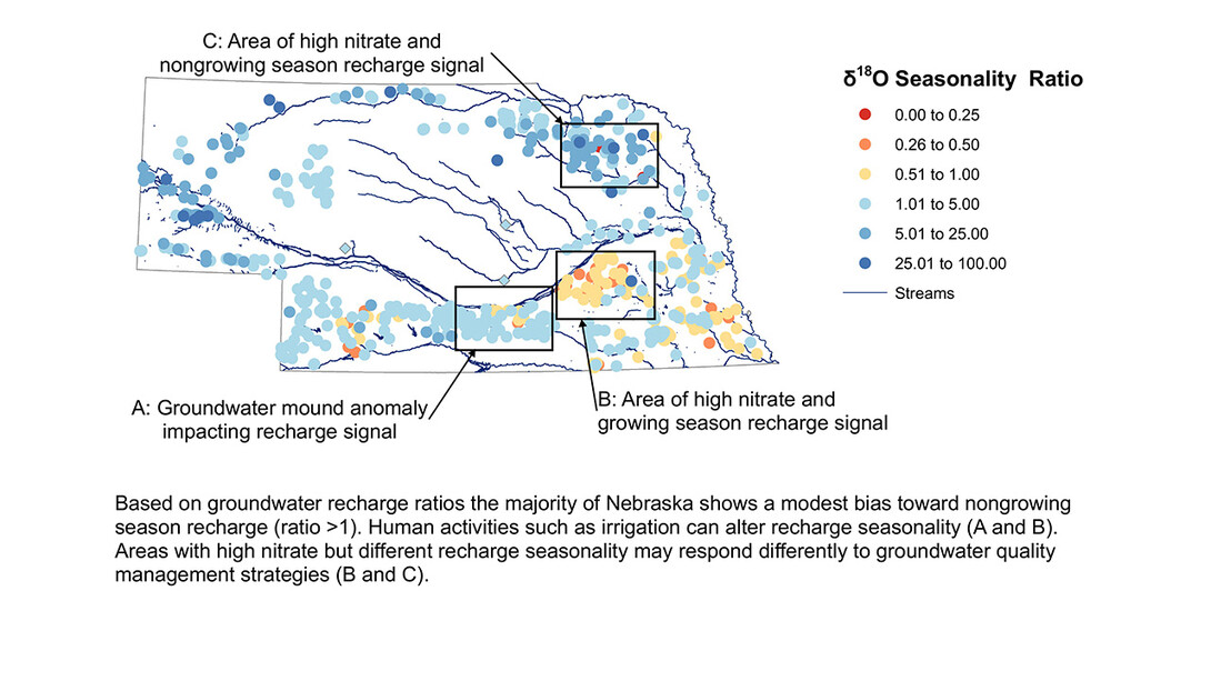 Nebraska’s summers are typically wetter than the winter months, so why does the recharge happen more often during a drier season? There are several reasons, Cherry said. One is that potential evapotranspiration from soil and plants exceeds rainfall, meaning that there isn’t excess water available that can become groundwater recharge. Human impact is another reason. Nebraska’s groundwater supply is frequently used for irrigation-powered agricultural operations. In areas of intensive canal irrigation with the Platte River as the source, Cherry found what appeared to be a non-growing (winter) season recharge ratio that actually is mostly Platte River water recharged through canals. In some intensively pivot-irrigated areas, Cherry said, the water cycle has shifted the recharge signature toward the growing season.