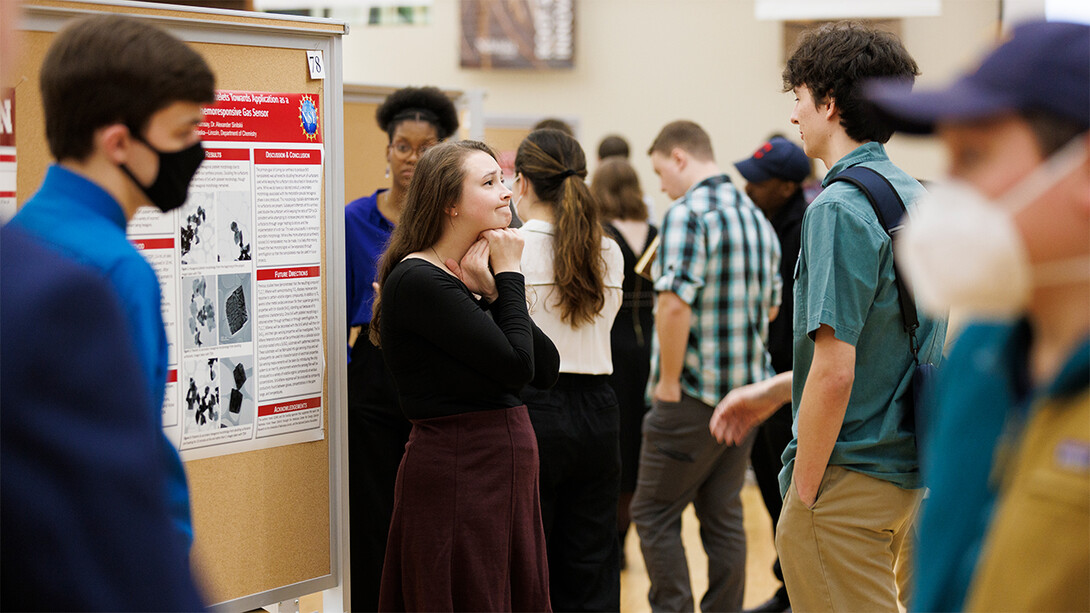 Attendees of the 2022 Student Research Days listen on as Alyssa Simpson, a McNair Scholar and junior majoring in physics and mathematics, explains the research she’s conducted under the tutelage of Nebraska’s Xia Hong.
