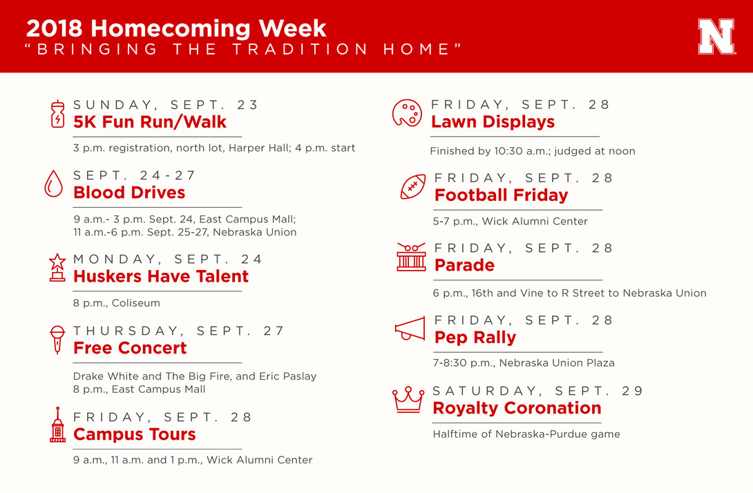 This year’s University of Nebraska-Lincoln Homecoming week begins Sept. 23 and will carry the theme “Bringing the Tradition Home.”