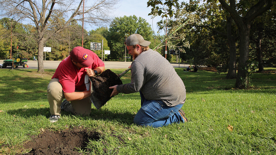 Todd is running the planting project with assistance from Landscape Services. The trees are being paid for by an anonymous NU Foundation donor and came from Great Plains Nursery, owned by university alumna Heather Byers.